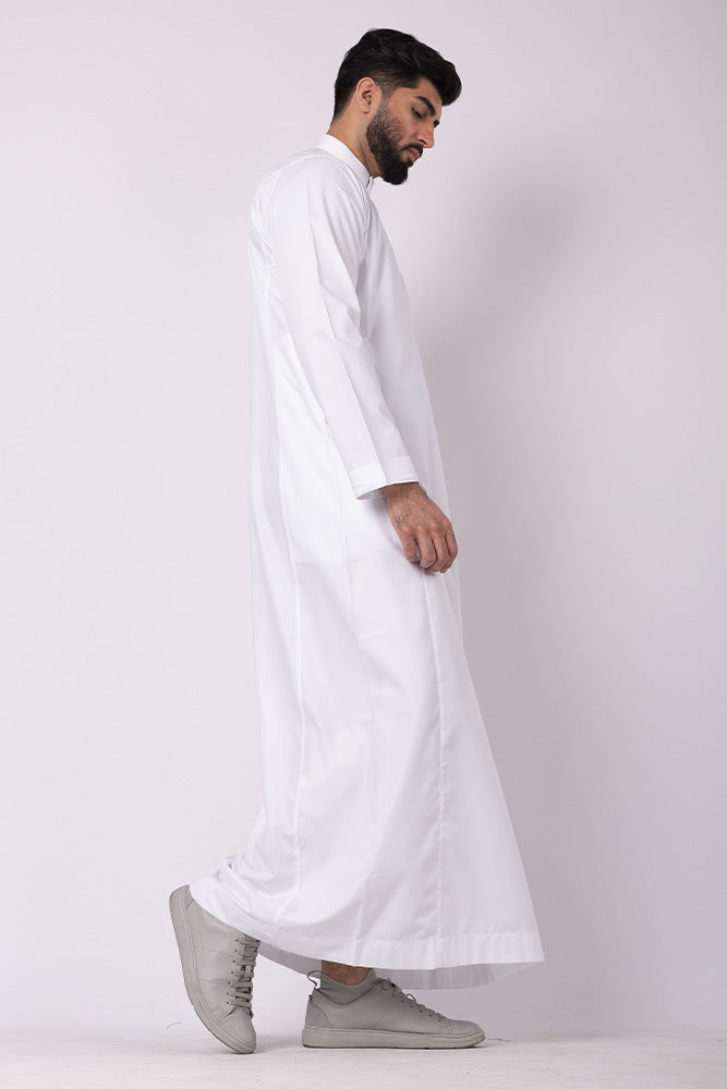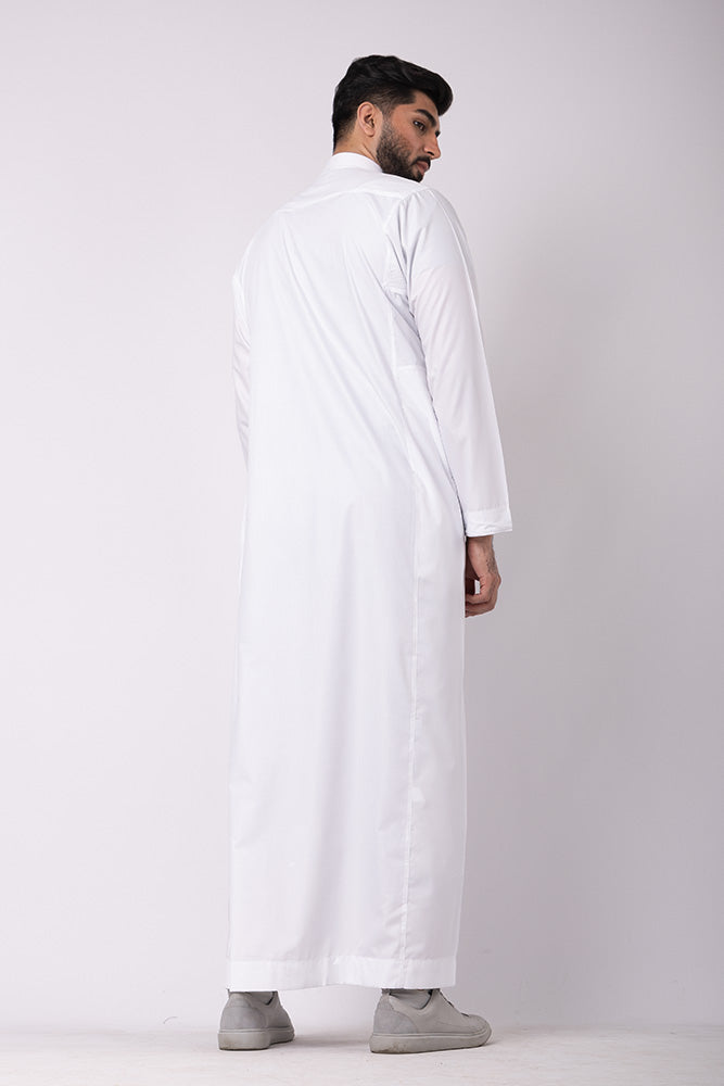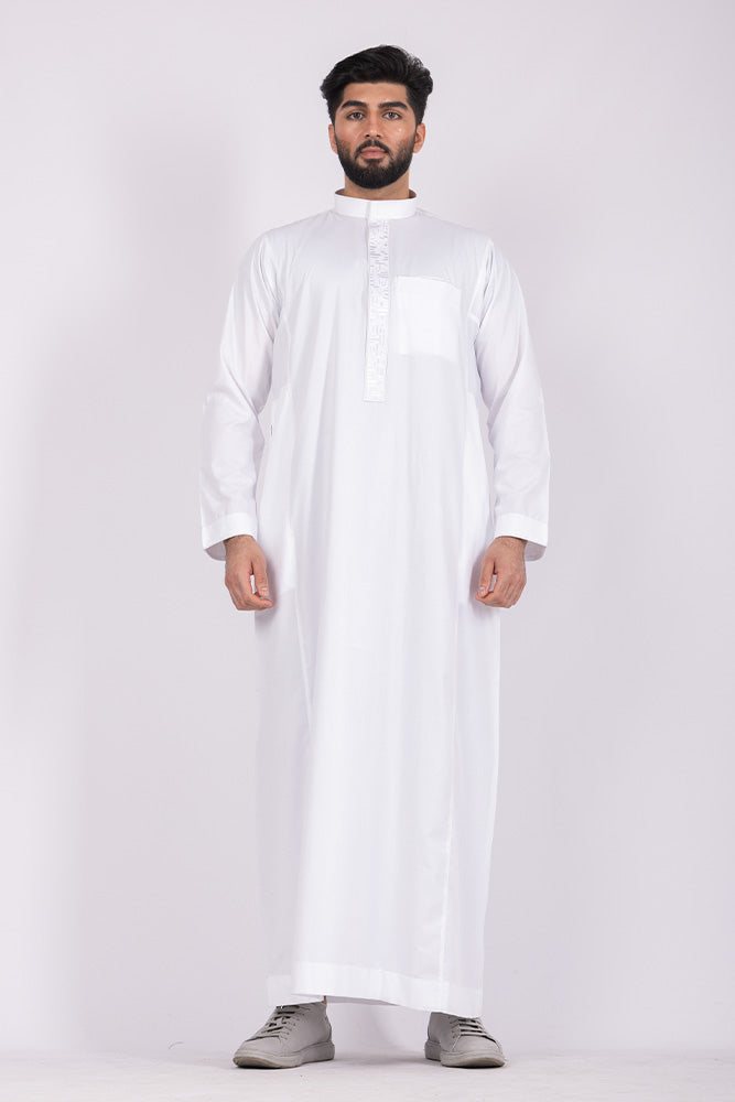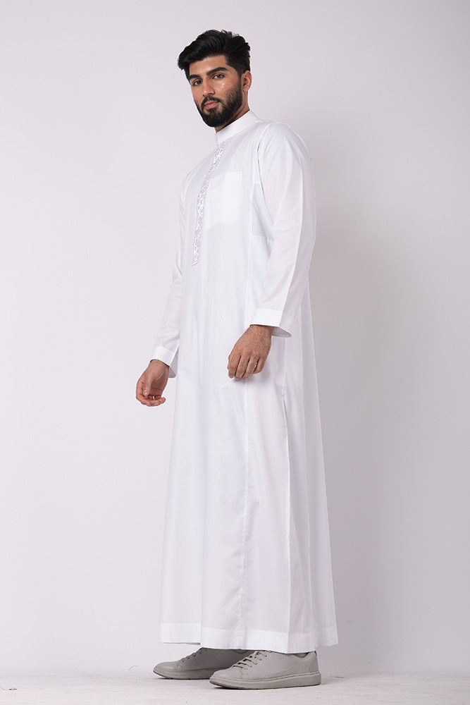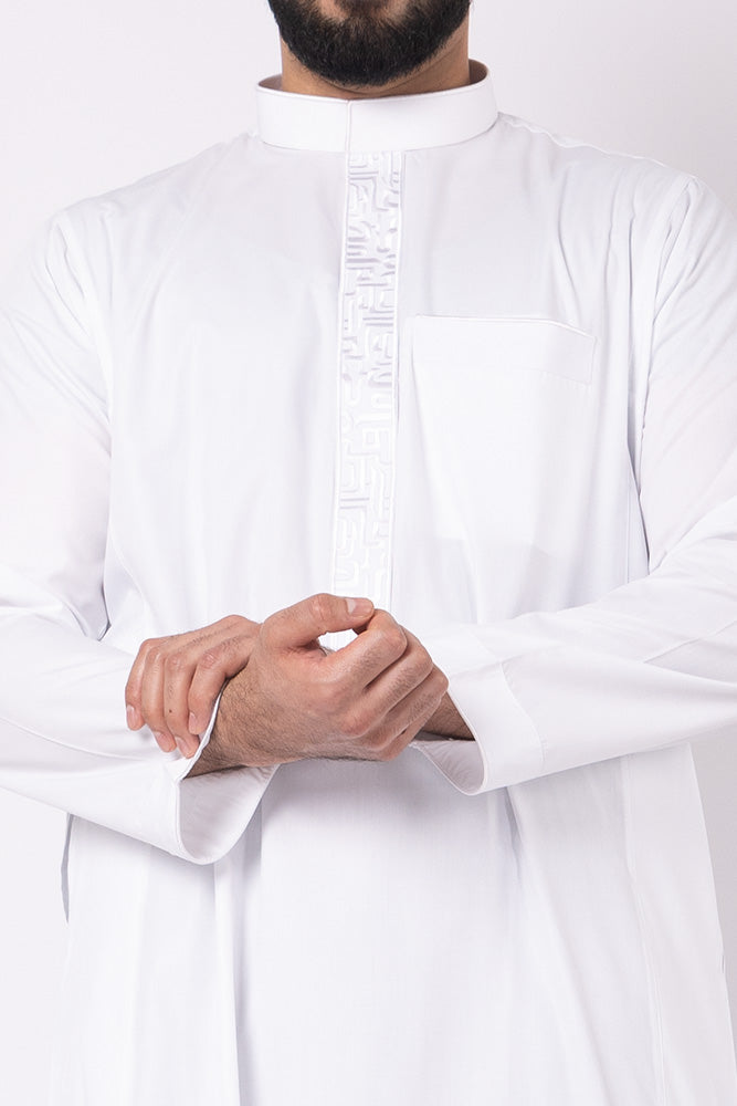 We have introduced White Al Huruf Embroidery Thobe|Jubba with very fine detailed and embossed feel work on front chest/collar/cuff.