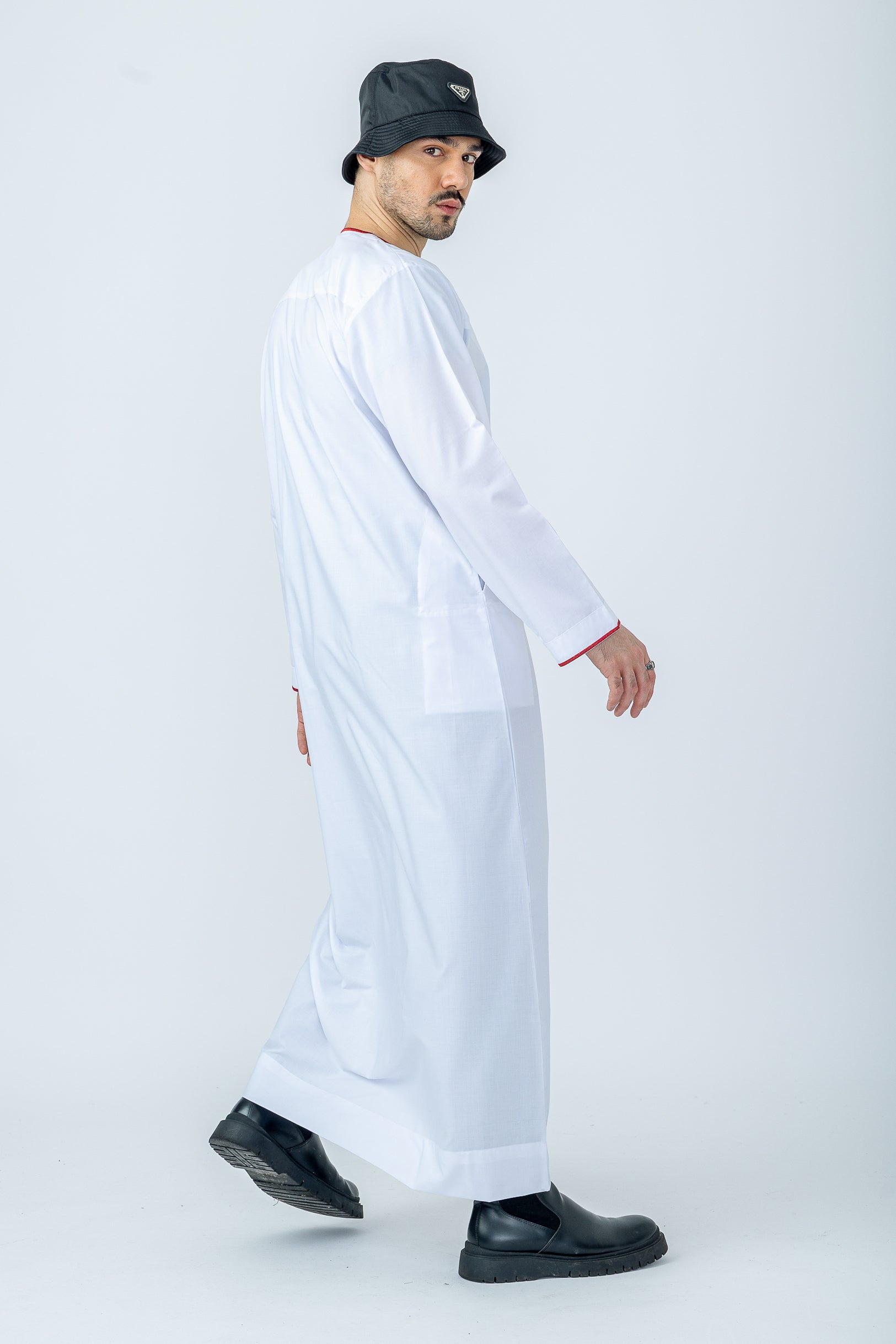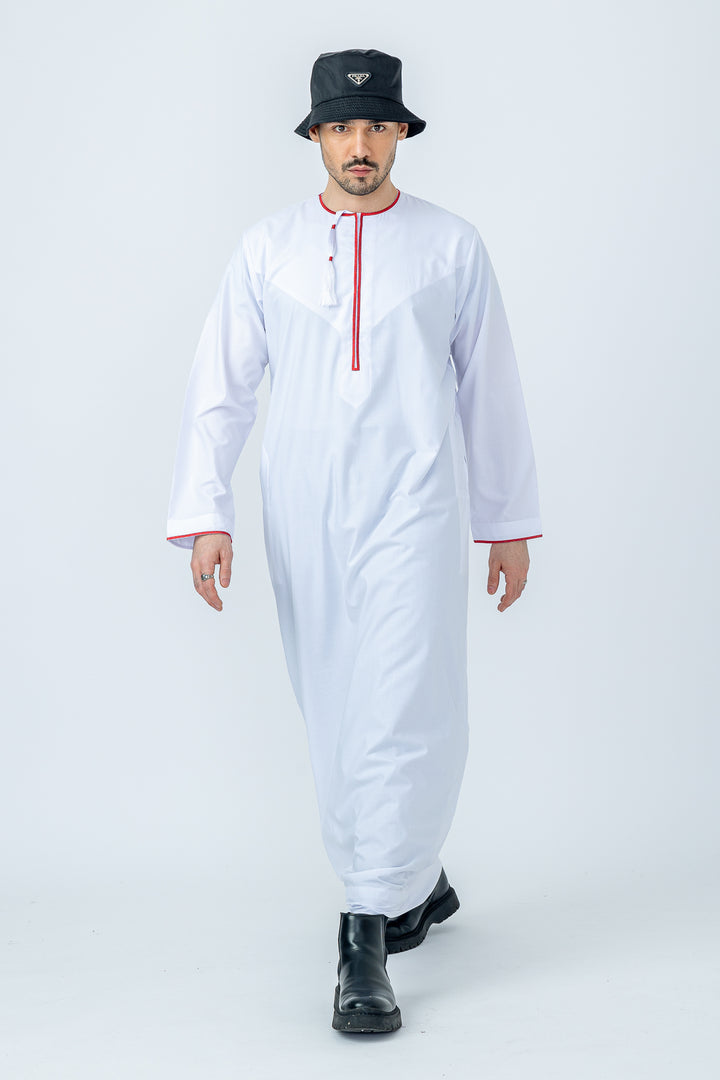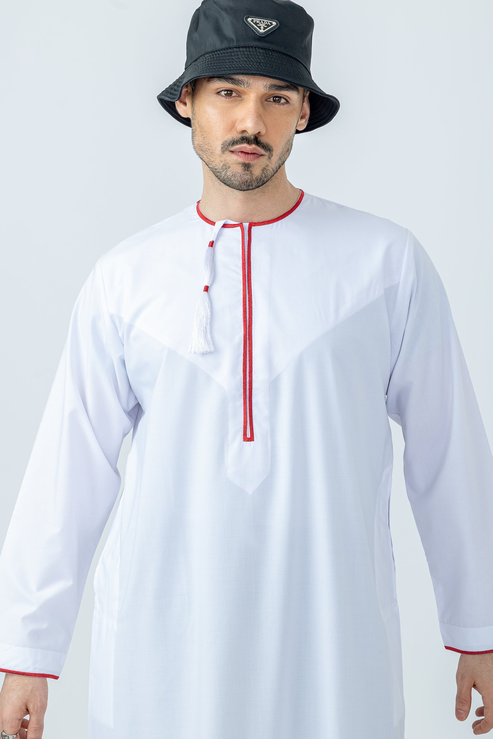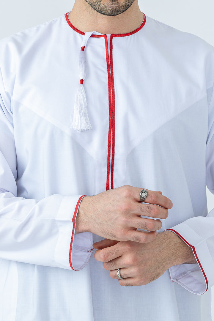Feel the sophistication and glamour of the White|Maroon Habeel Thobe! Crafted from a luxurious, soft polyester material and featuring intricate embroidery work with Japan Maroon thread, this magnificent thobe will be the showstopper at any event. With two side pockets, side tassels, and a matte finish, you can feel confident in the quality and design of this statement piece!