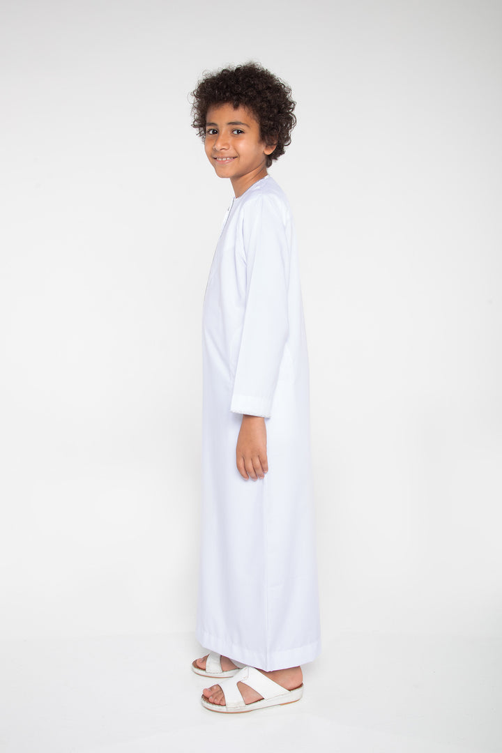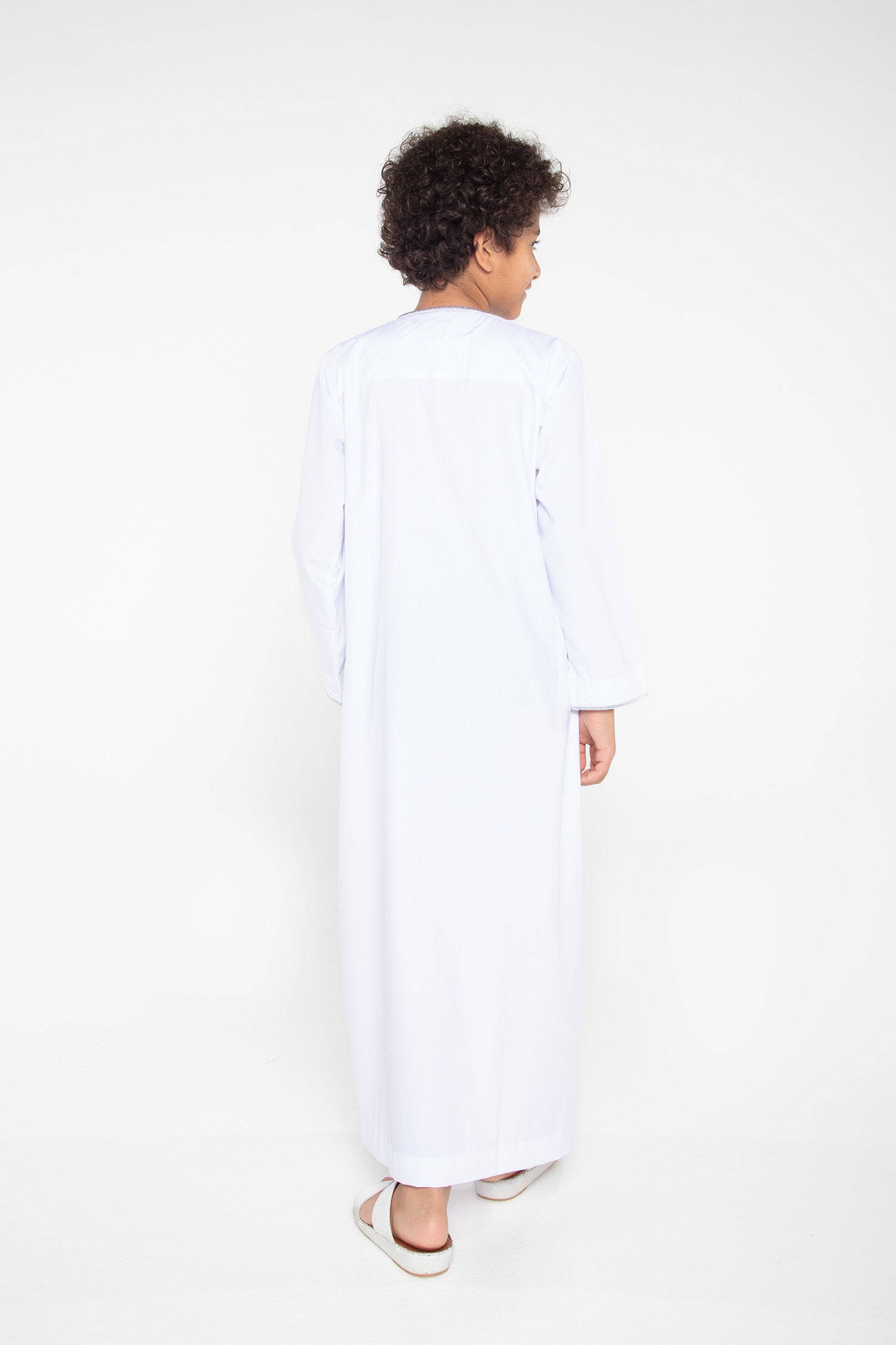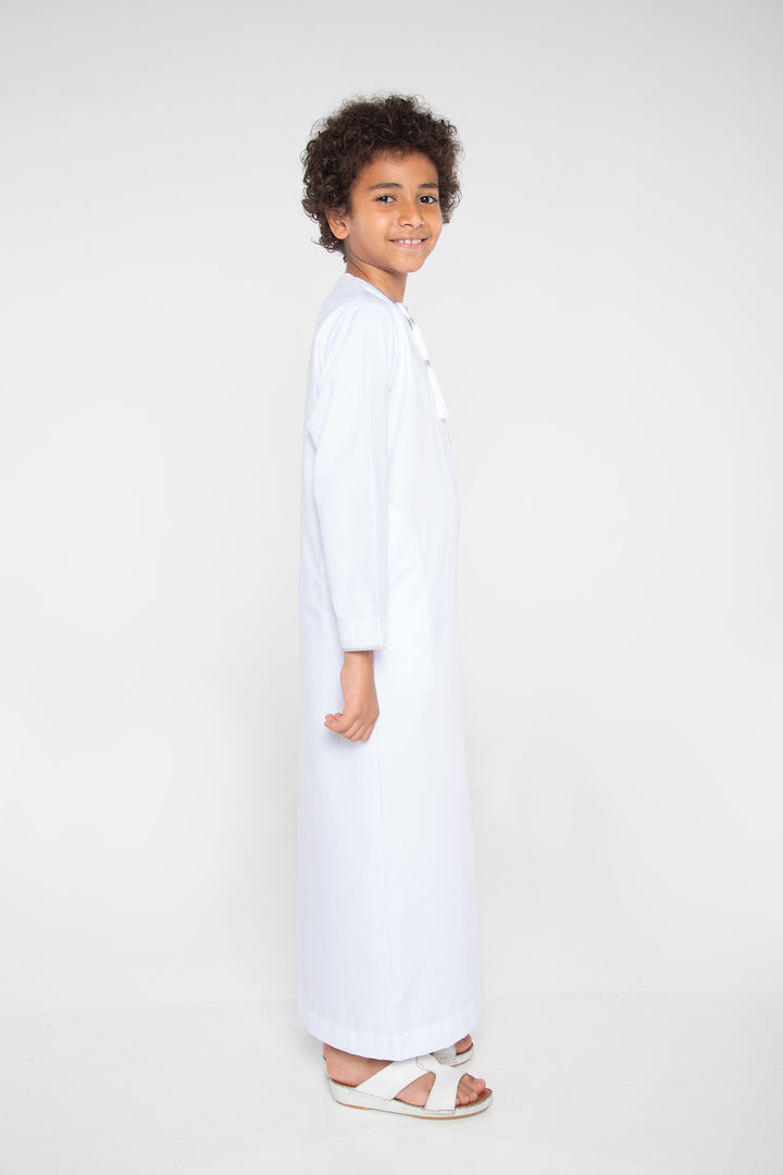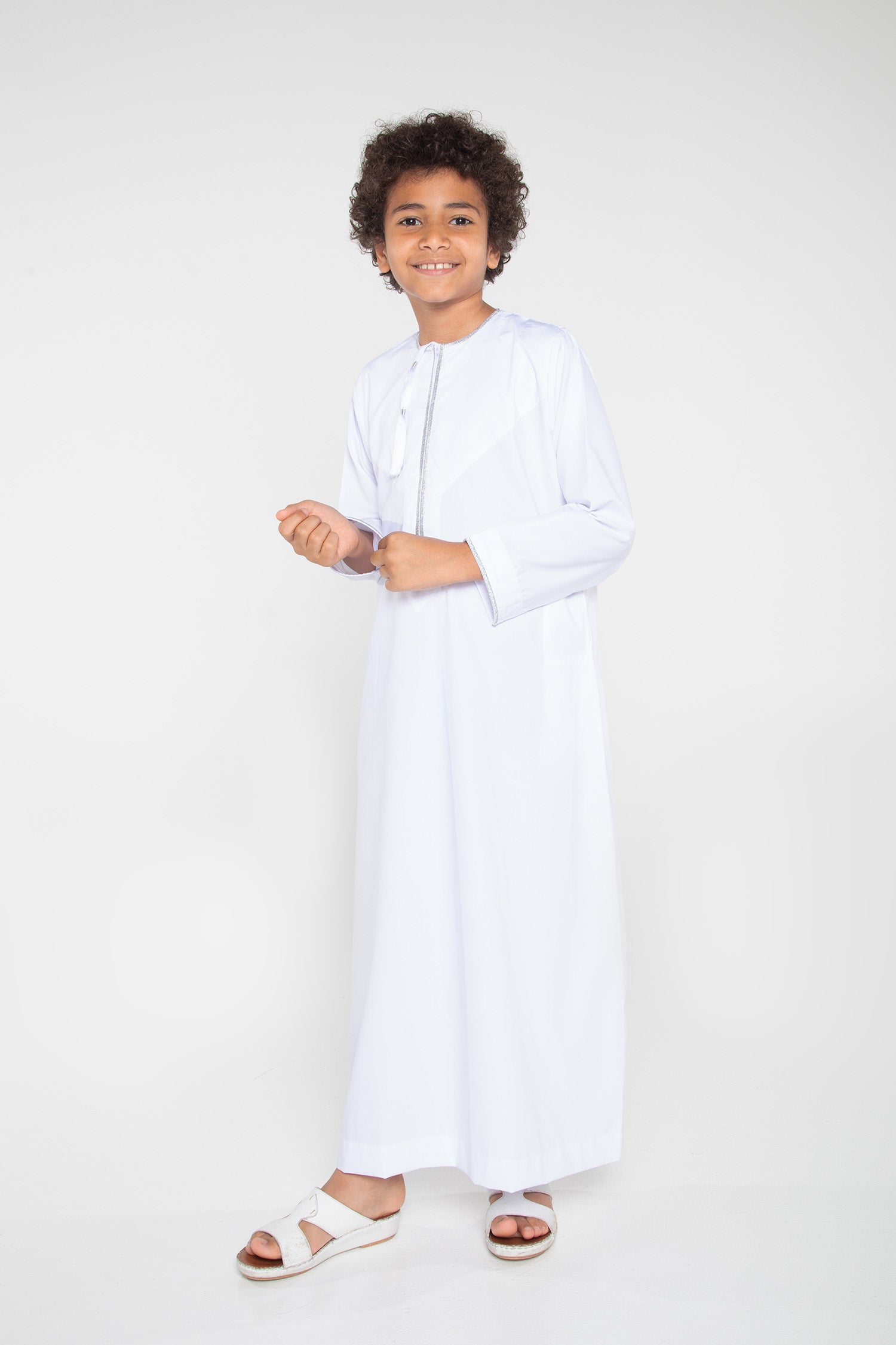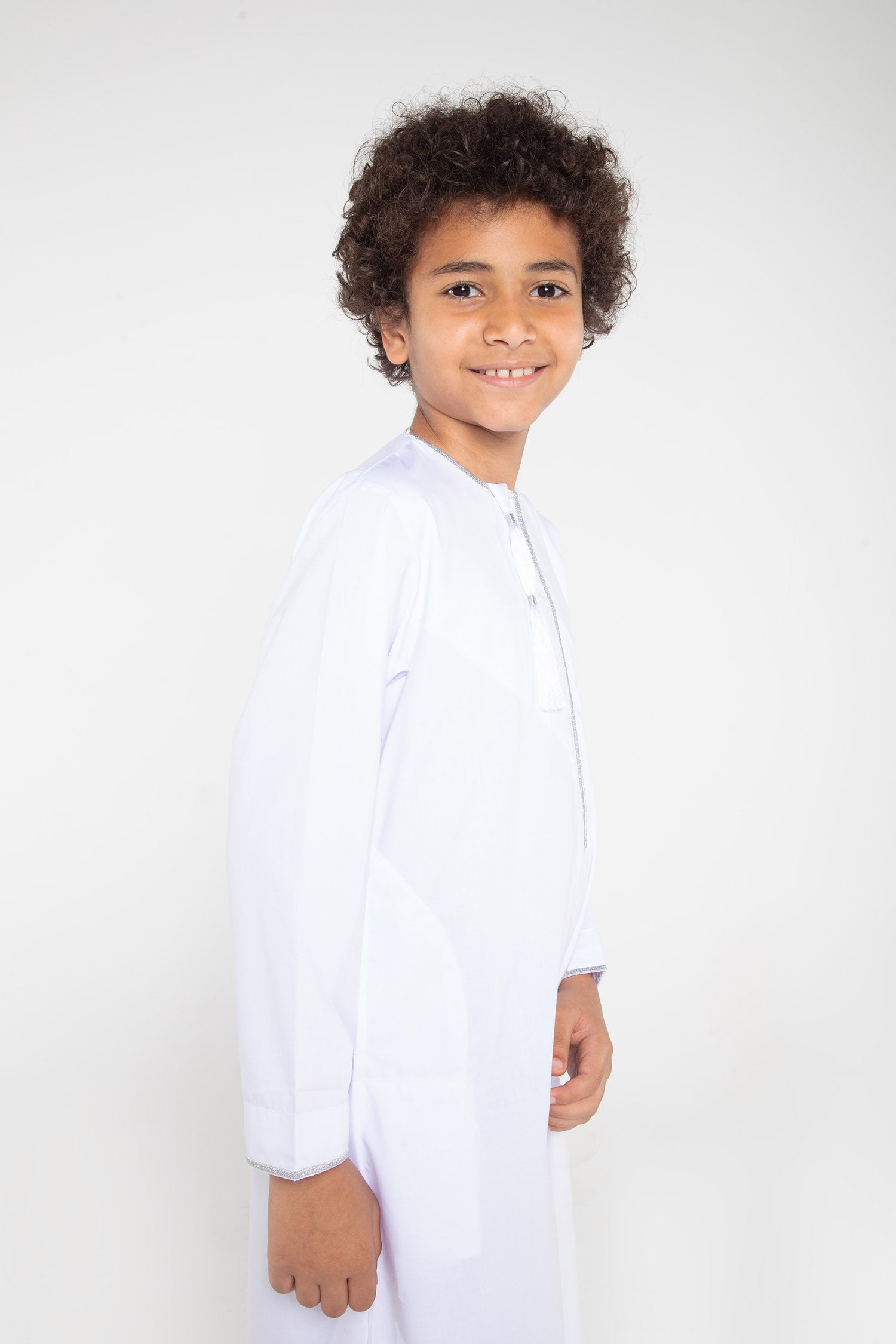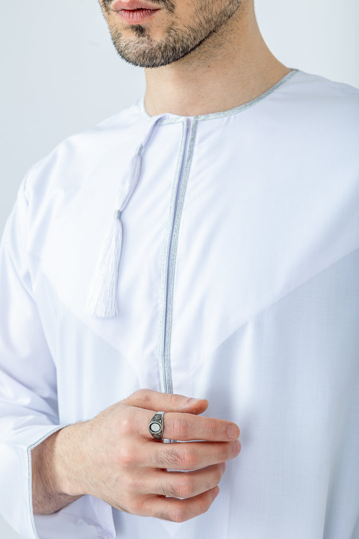 This luxurious White|Silver Habeel Thobe is perfect for those seeking an elegant look. Crafted with a tailored fit and made from 100% polyester, it is exceptionally soft and comfortable. This timeless Thobe is accentuated by a non-removable tassel and two side pockets, making it a classic and versatile piece that can be worn for many years to come.