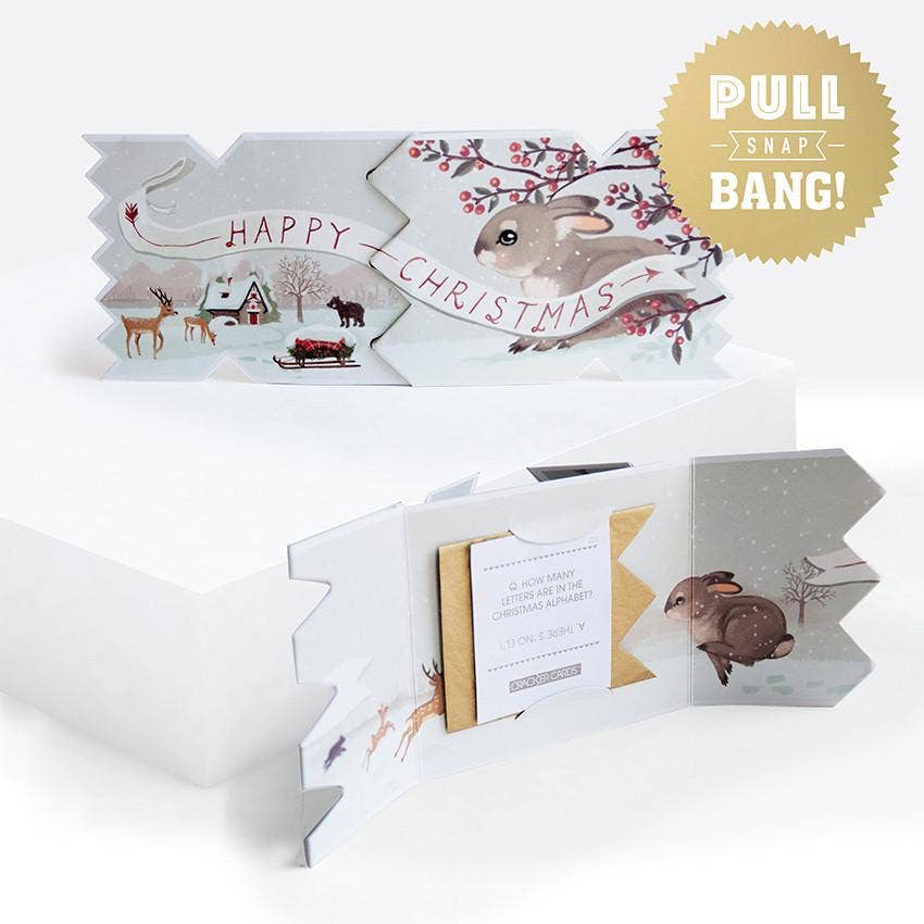 "Celebrate the festive season with a bang with this cracking Christmas card! Perfect for Christmas, every card is embedded with a cracker snap, and goes 'bang' when pulled open; just like a traditional Christmas cracker! Each card comes with a joke, a paper hat, and has slots to hold a gift voucher if desired; providing an innovative gift experience not provided with conventional greetings cards.